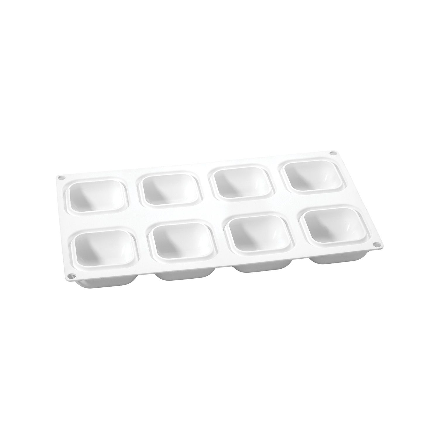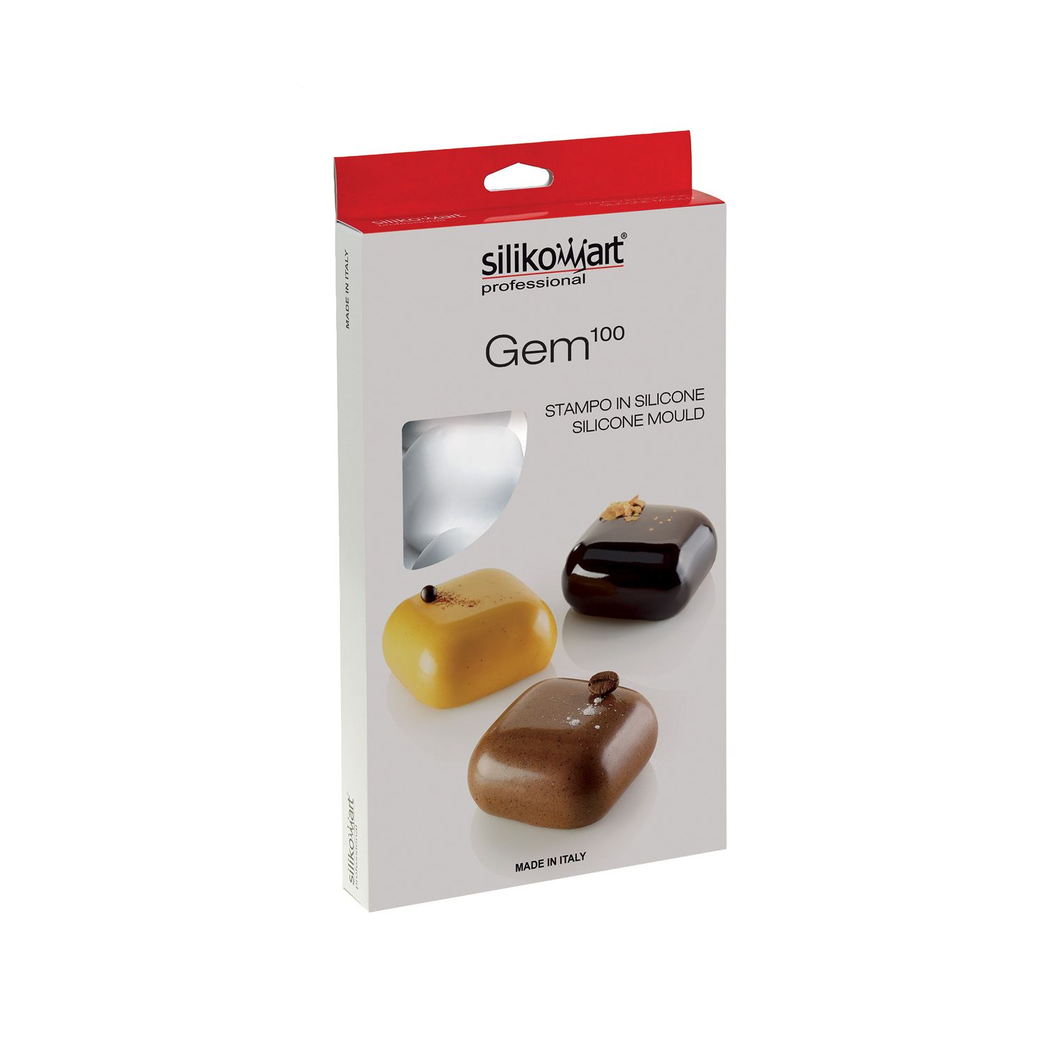 Gem100 silikonski kalup omogućava izradu savršenih monoporција zapremine 100 ml koje će osvetliti vašu vitrinu. Njegov jedinstveni dizajn odlikuje se inovativnim ivičnim detaljom u gornjem delu svake šupljine koji daje poseban zaobljeni oblik bazi preparata. Veoma je versatilan i pogodan za izradu semifreda, sladoleda i pečenih deserata. Otporan na temperature od -60°C do +230°C.