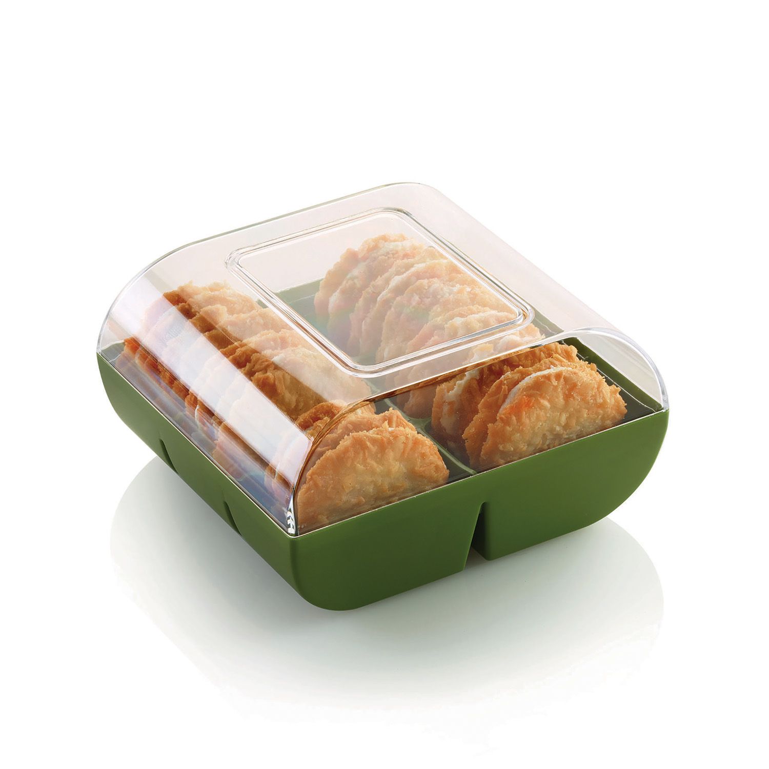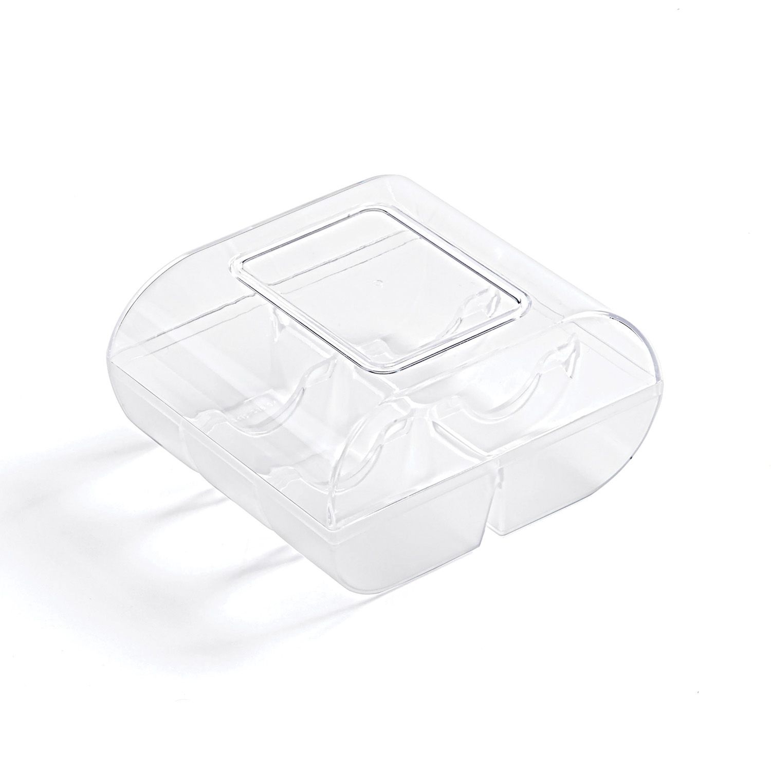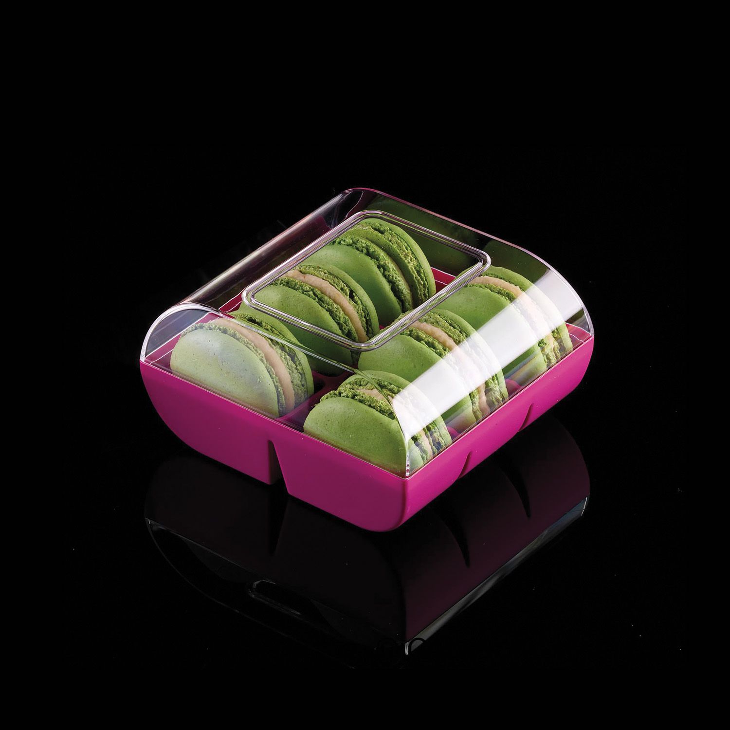 Macadò 6 – set 90 pcs je profesionalno rešenje za pakovanje i prezentaciju makarona, sastavljeno od 90 praktičnih plastičnih kutija za 6 makarona. Svaka kutija ima providni poklopac i podlogu dostupnu u 8 dizajnerskih boja, sa strukturom koja odvaja svaki makaron i štiti ga od oštećenja tokom izlaganja i transporta. Poklopac se hermetički zatvara stabilnim spojem, čime se makaroni štite od vlage, dok providnost omogućava jasan pregled proizvoda unutra. Kutije su dizajnirane u modularnoj veličini koja omogućava tačno slaganje 20 Macadò kutija za 6 makarona na profesionalne podloge dimenzija 60×40 cm, a mogu se personalizovati nalepnicama, trakama ili drugim dekorativnim elementima.