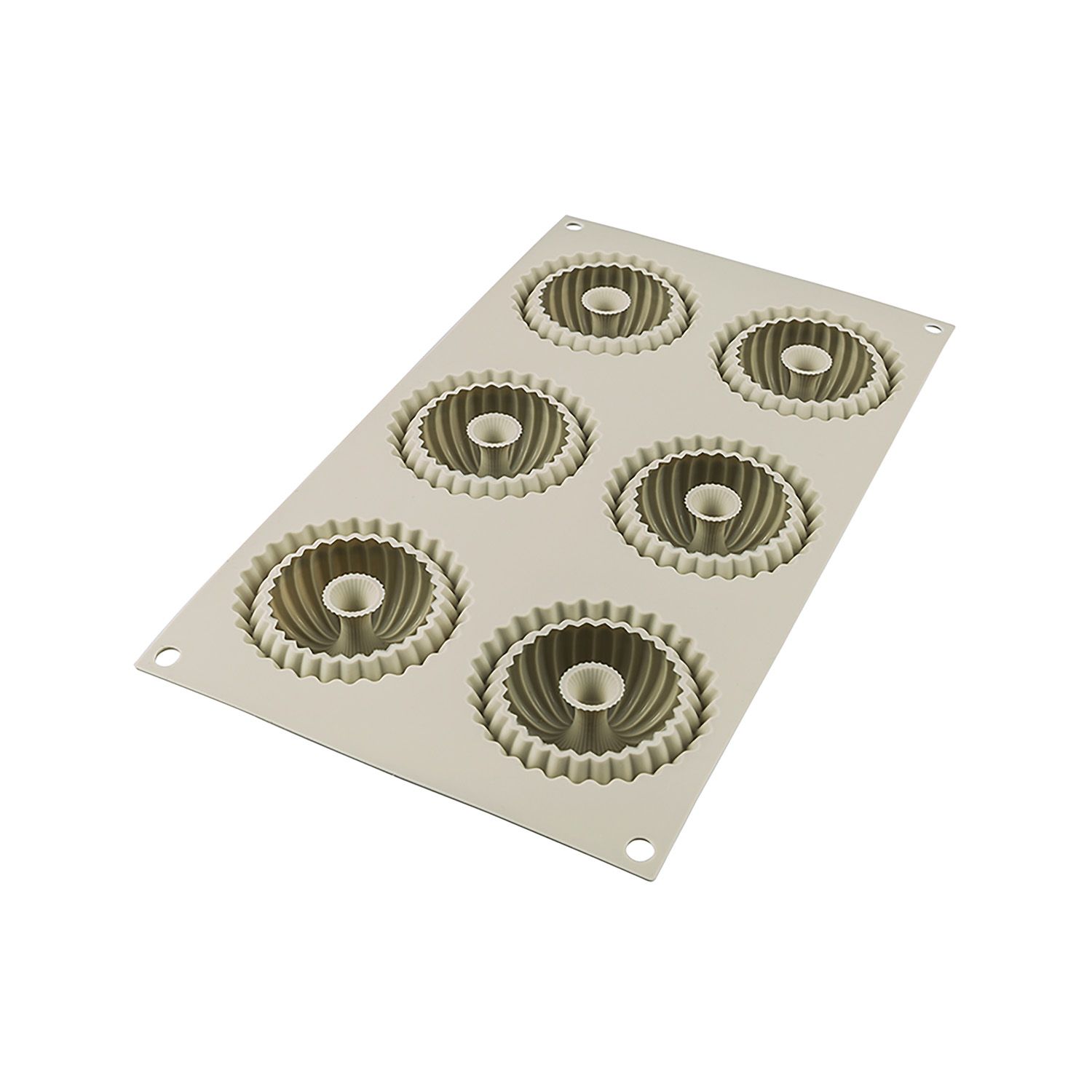 Mini Raggio je platinasti silikonski kalup elegantnog dizajna koji vašim desert kreacijama daje izgled rafiniranog lepezastog uzorka sa zracima. Svako od 6 udubljenja opremljeno je revolucionarnim unutrašnjim obodom koji obezbeđuje blago zaobljenu osnovu vašim kreacijama. Savršen za pripremu impresivnih musa i semifreddo deserta, ali i za pečene varijante, Mini Raggio garantuje besprekorne rezultate. Otporan na temperature od -60°C do +230°C.