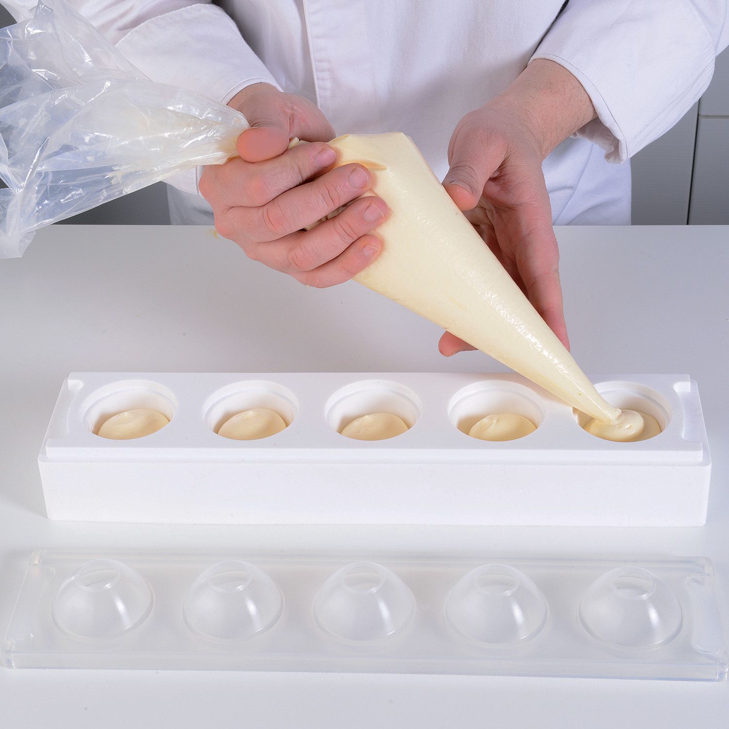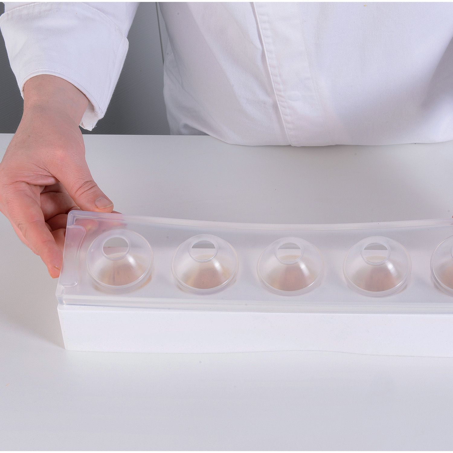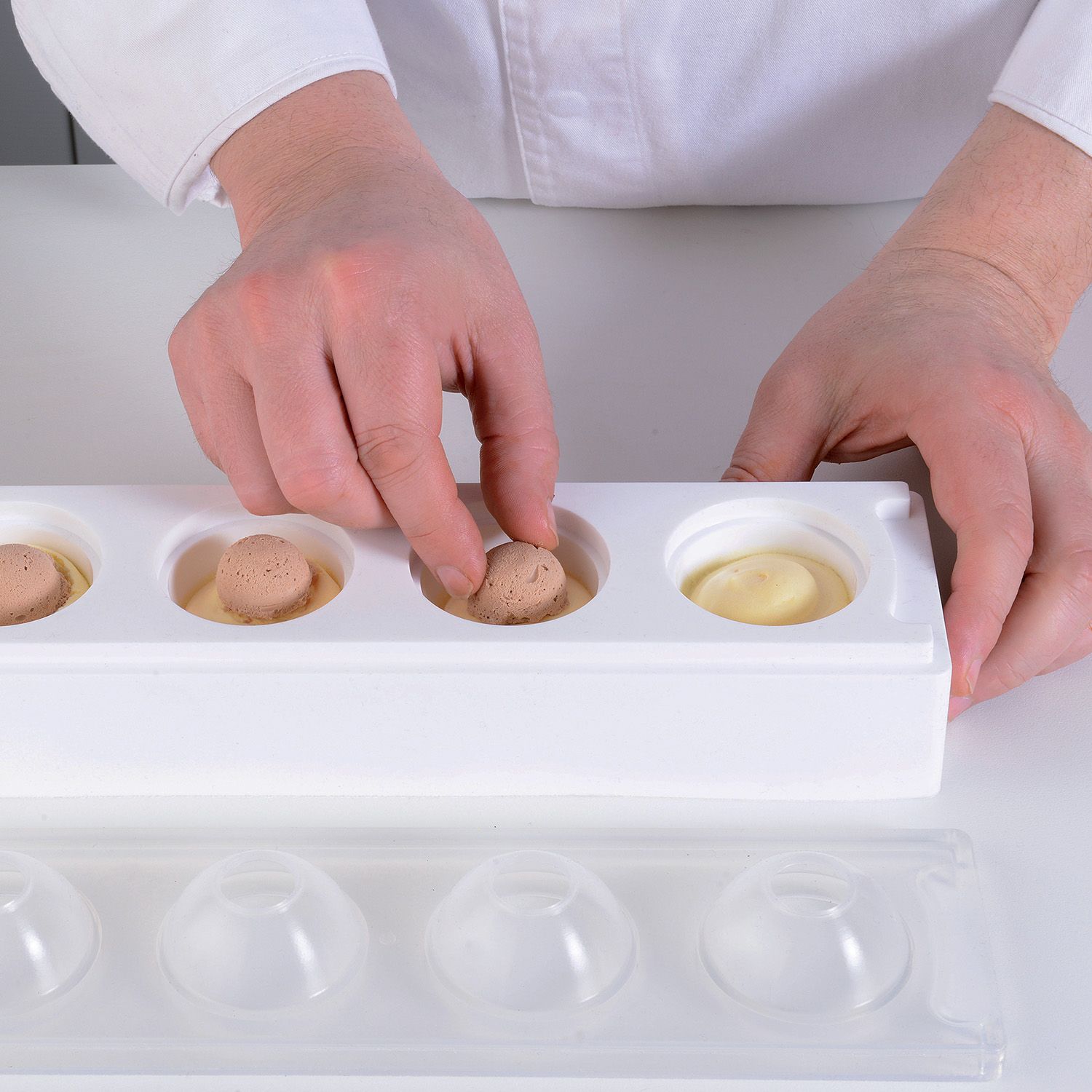 Mul3D Egg je profesionalni silikonski kalup koji omogućava pripremu deserta i elegantnih pojedinačnih porcija u obliku jajeta. Kalup se sastoji od dva dela: bele silikonske osnove (deo B) i providnog poklopca (deo A) koji olakšava prepoznavanje sadržaja tokom punjenja. Savršen za pripremu musa, semifreddo deserta i drugih slastičarskih kreacija u originalnom obliku. Otporan na temperature od -60°C do +230°C.